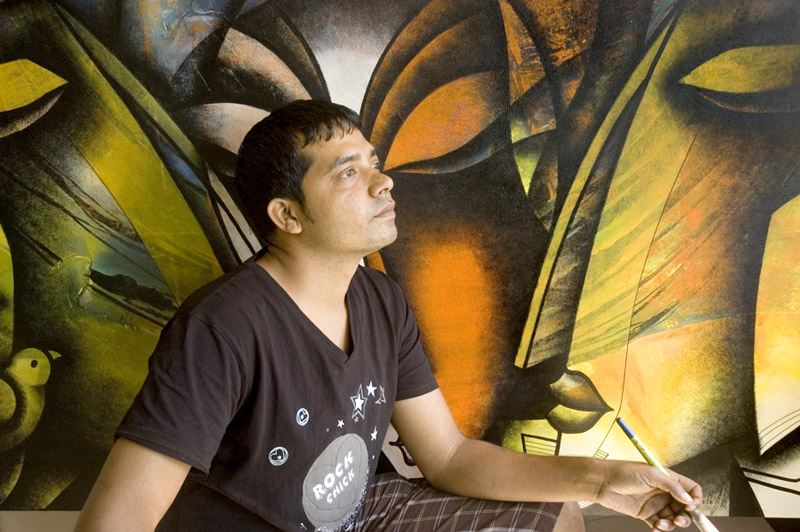 Sachin Jaltare’s works carry the influences of Abstract Expressionism since his days in the JJ School of Art. Sensuous and pliable, the mellowed images evoke both an ethereal and mundane feeling. The communion of the man and woman, apparently Siva and Parvati surfacing repetitively in his works appear as only partially visible beings – a treatment so justifiably employed to render an ethereal affair.